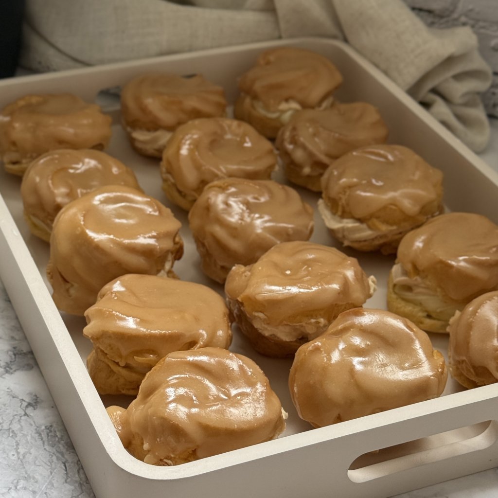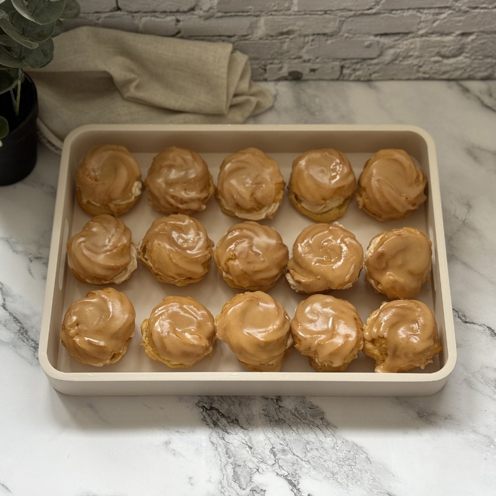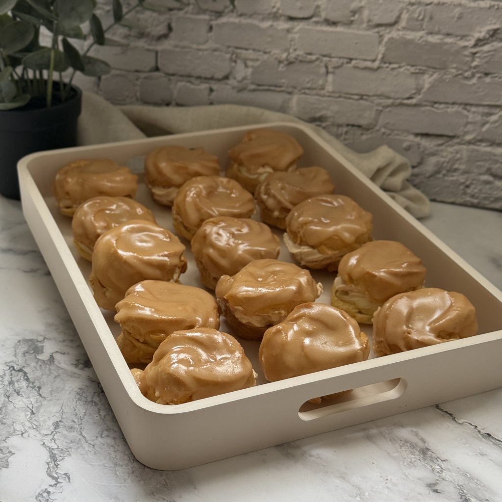 Poctivé mini větrníky s pudinkovým krémem, karamelovou šlehačkou a karamelovou fondánovou polevou. Lehký odpalovaný dezert, který nikdy nezklame.