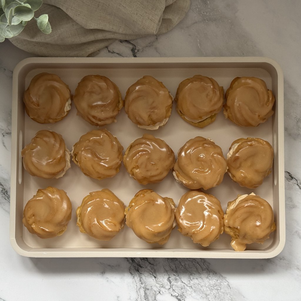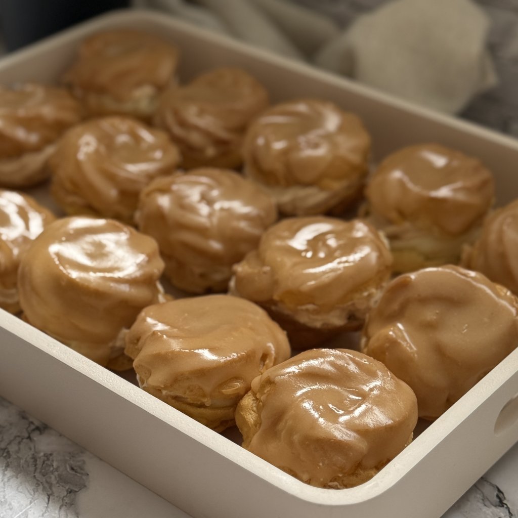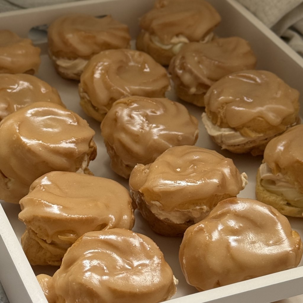 Poctivé mini větrníky s pudinkovým krémem, karamelovou šlehačkou a karamelovou fondánovou polevou. Lehký odpalovaný dezert, který nikdy nezklame.